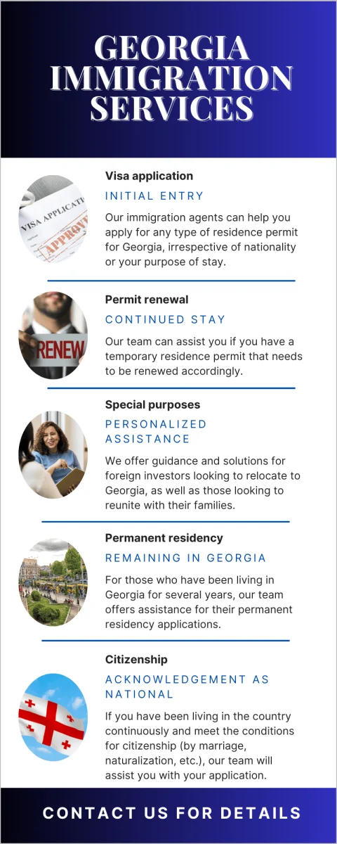 | How we can help you | Our immigration lawyers in Georgia assist with a wide range of issues, from residence permit/ citizenship applications to appeals, and other matters of interest for immigrants. |