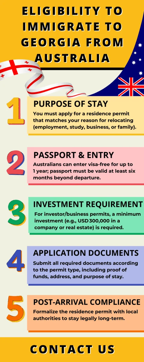 We invite you to rapidly check the eligibility criteria to relocate to Georgia from Australia, from this infographic:
