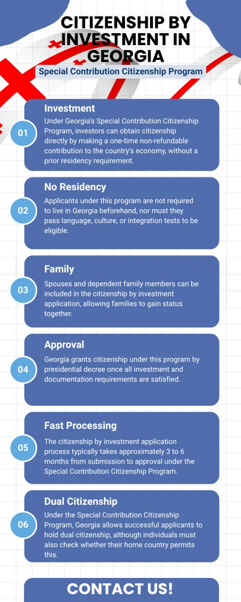 Although obtaining citizenship by investment in Georgia is not directly possible, you can contact our team for further assistance regarding the residency program and how to benefit from it.